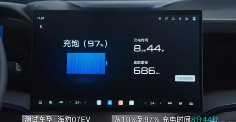 从比亚迪官方公布的海狮07EV的实测情况来看,10%到70%,实测时间为4分51秒,从10%到97%,实测时间仅需8分44秒。