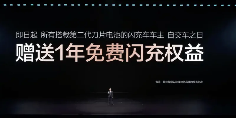 同时比亚迪宣布,即日起,所有搭载第二代刀片电池的闪充车车主,自交车之日赠送1年免费闪充权益。