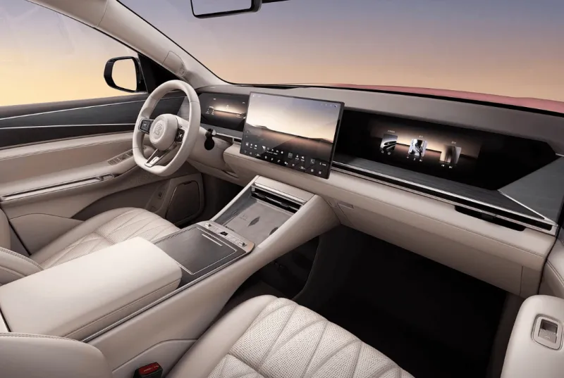 车内可实现7屏联动交互,包含15.6英寸中控屏、12.3英寸仪表、26英寸W-HUD、空调旋钮屏、后排空调控制屏以及后排可安装2个13英寸的BYD Pad。新车还提供冷暖冰箱,-6℃到50℃温度可调,容积为4.5L。