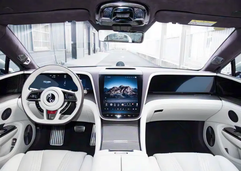 新车内饰同样彰显个性与豪华,中控台采用对称式设计,大尺寸竖状中控屏搭配两侧内嵌式液晶仪表+副驾娱乐屏。提供4座和5座可选,座椅表面采用Nappa真皮包覆,前排可实现最多20向调节,包含腰部支撑、通风加热和热石按摩等各项功能。