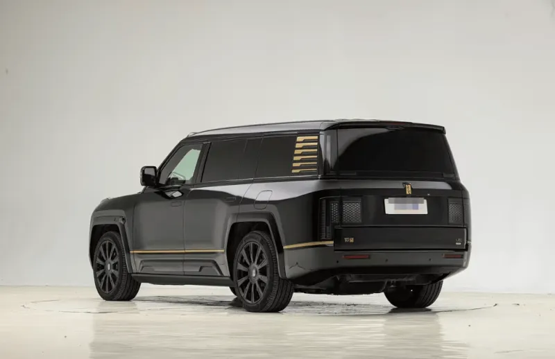 外观方面,2026款仰望U8L延续现款车型的设计,其采用黑色与金色的双色搭配,并引入24K真金打造的车标,提升其尊贵感。整体弱化了越野风格,车身尺寸,车辆长宽高分别为5400/2049/1921mm,轴距为3250mm。
