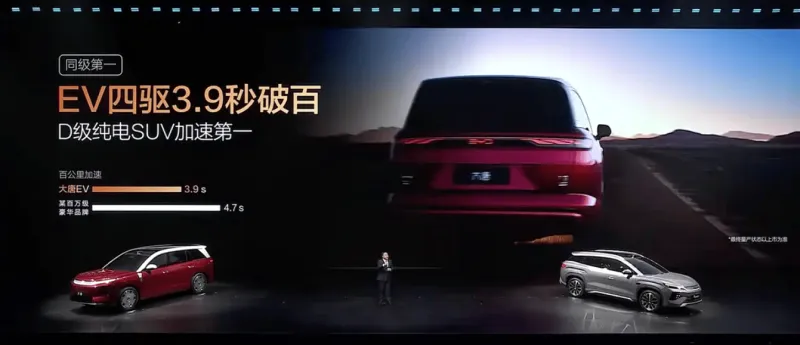 动力方面,DM-i车型采用单电机,最大功率300千瓦,最高车速240km/h。大唐EV车型纯电续航里程950km,0-100km/h加速3.9秒。
