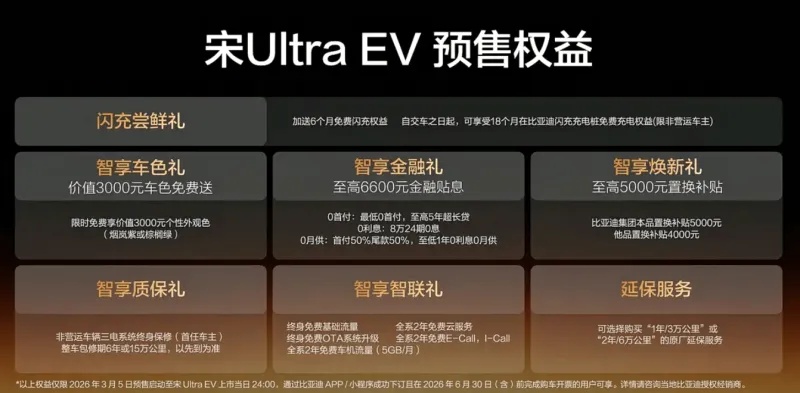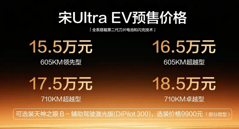 比亚迪宋Ultra EV开启预售,新车共计推出X款车型,预售价15.5-18.5万元,宋Ultra EV融合了宋L EV和宋L DM-i的设计精髓,新车拥有第二代刀片电池、闪充技术及可选装激光雷达,新车将于3月底正式上市。