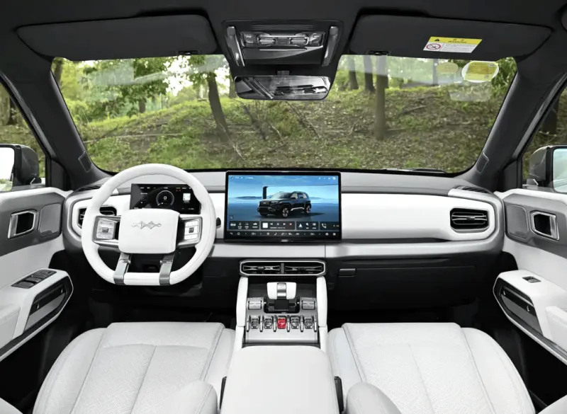 内饰方面,延续了豹5的一些设计理念,尤其是中控的排挡按键区域,车内配备8.8英寸全液晶仪表盘和15.6英寸中控屏,方向盘是家族化经典的四辐平底设计,新车配备压缩机冷暖箱,支持制冷-6-6°C、制热35-50°C。