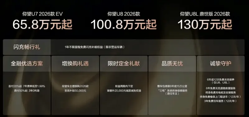 2026款仰望U7正式上市,售65.8万元起。新车首搭第二代刀片电池,CLTC纯电续航里程达到1006km。